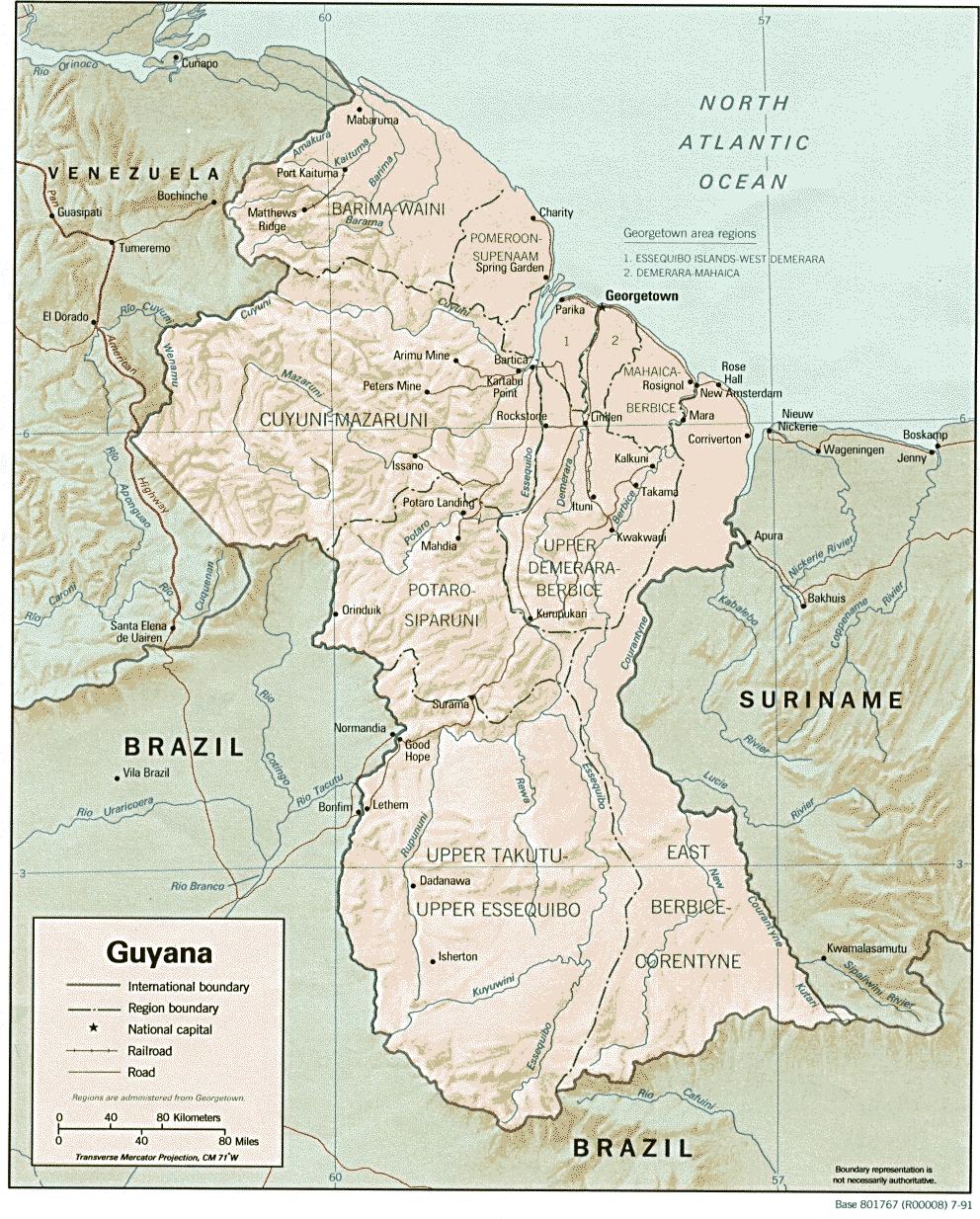Guyana (izquierda) con la Guayana Francesa (derecha). En medio está