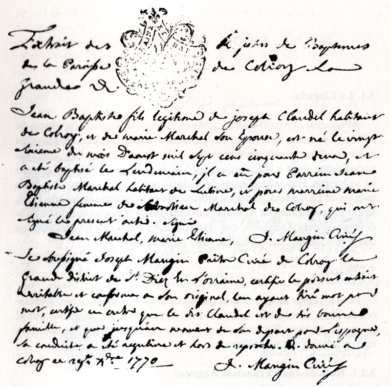 nacimiento de Jean Baptiste Claudel Marchal y la segunda parte es una